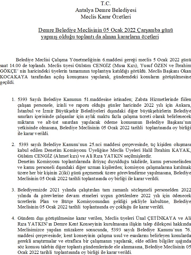 05.01.2022 Ocak Ayı Meclis Karar Özetleri