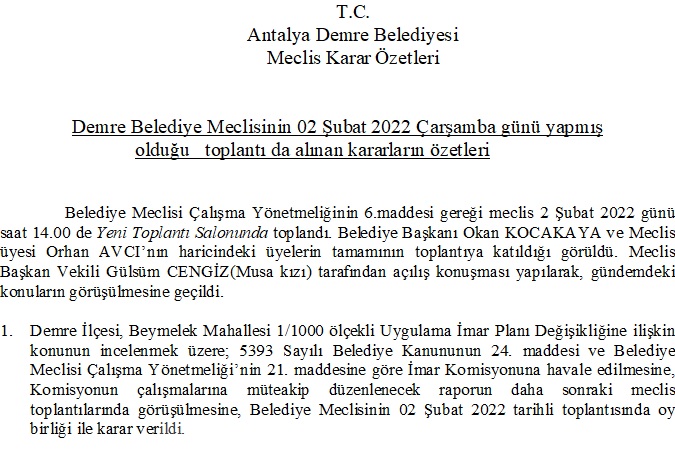 02.02.2022 Şubat Ayı Meclis Karar Özetleri