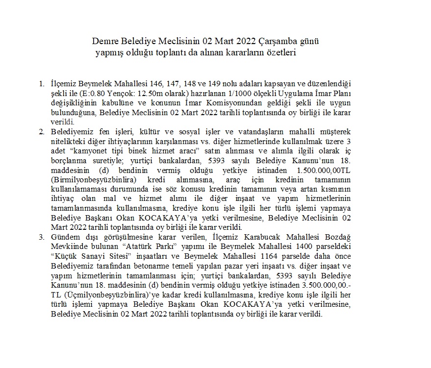 02.03.2022 Mart Ayı Meclis Karar Özetleri